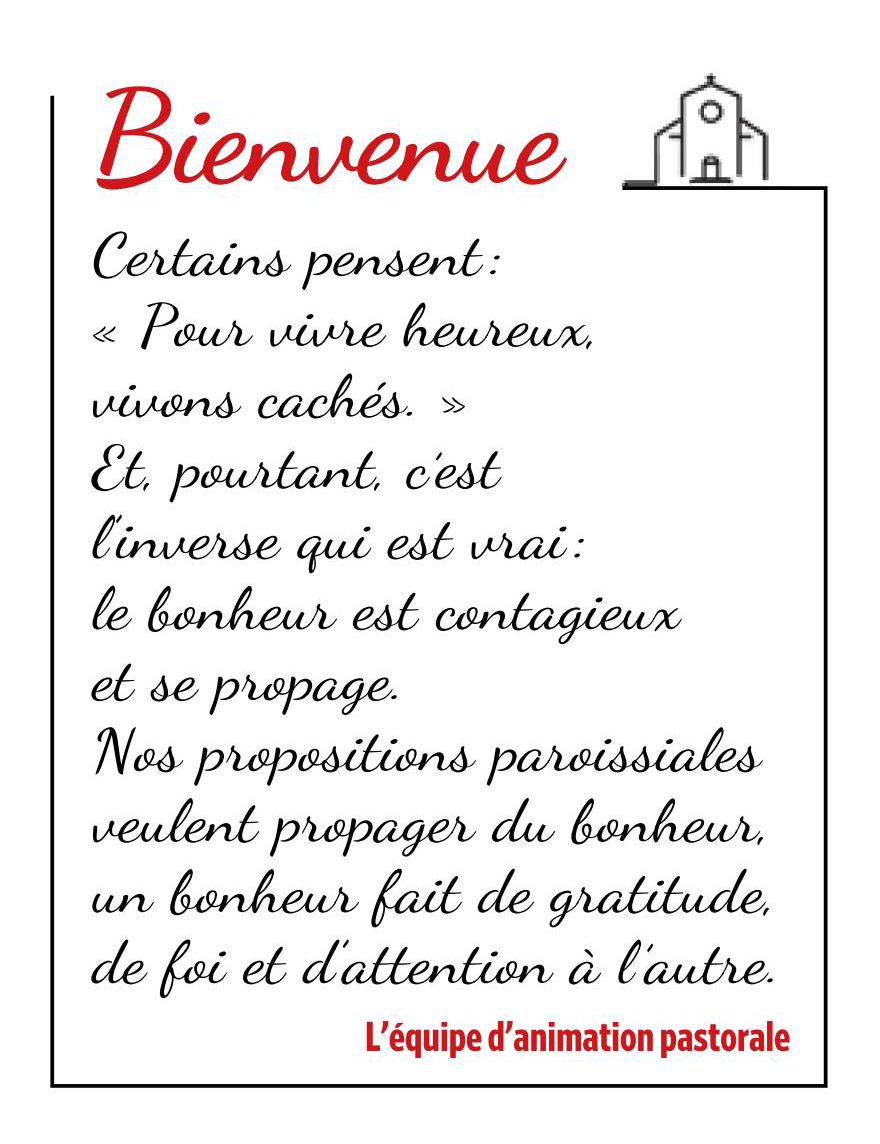 « Pour vivre heureux, vivons cachés.» Et, pourtant, c’est l’inverse qui est vrai: le bonheur est contagieux et se propage. Nos propositions paroissiales veulent propager du bonheur, un bonheur fait de gratitude, de foi et d’attention à l’autre.